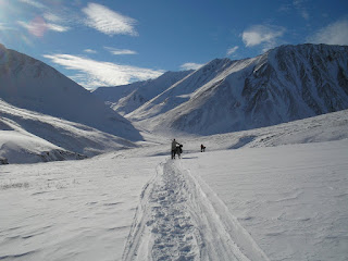 We left Puntilla at 5:00 AM and made it to Rohn just after sunset. We had -9 F and a stiff headwind for a few hours in the dark which subsided as we reached the mouth of the Pass. This section of trail can be one of the most challenging in the McGrath race. In 2006 there was extreme avalanche danger and we were hauled up in a shelter cabin just before the pass with wind chills off the chart and waited out over 24 hours before continuing on over the Pass. In 2005 I rode some on the Puntilla side and all the way to Rohn from Pass Creek and had the most fun downhill ride through the Dalzell Gorge. I have seen Rainy Pass at both ends of the scale of extreme.
